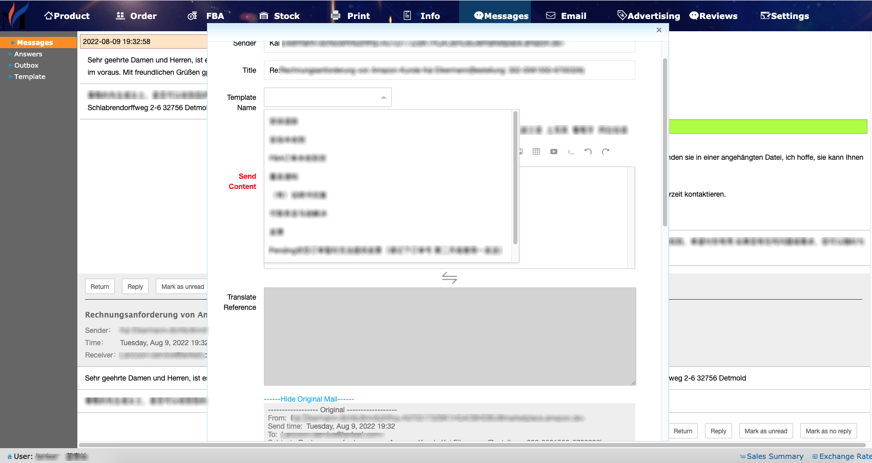 You can view and reply to the buyer's messages on application without going through the Amazon, you can create multiple reply templates to quickly reply to different types of questions, you can directly input your local language and automatically translate it into the language of buyer's country with one click, and the buyer's contextual messages can also be automatically translated, which is convenient to quickly understand and reply to the buyer's question.
