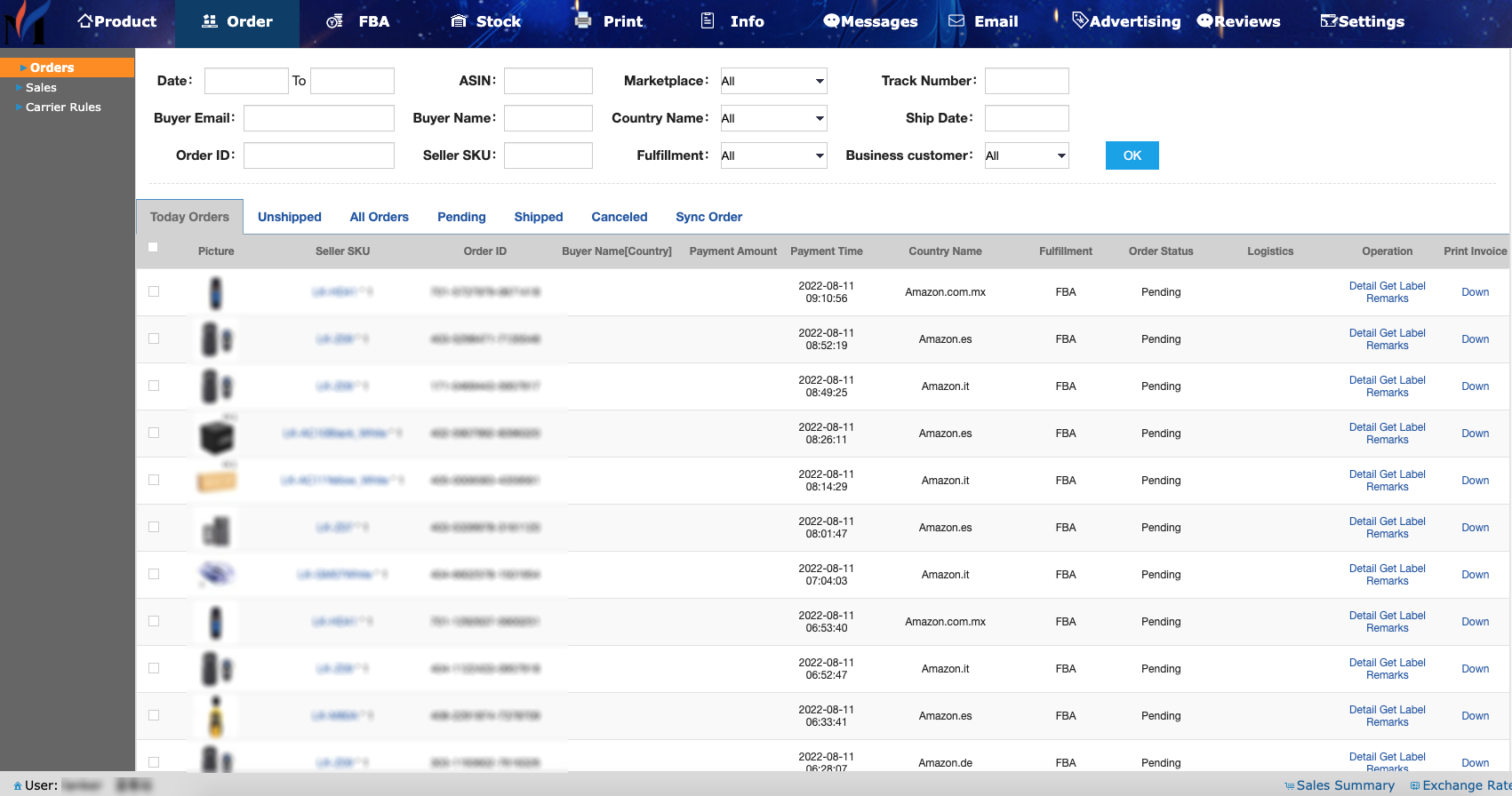 You can view the real-time order, query the status and amount of the order, download the invoice corresponding to the order; you can see the detail for order according to the marketplace, fulfillment type, ASIN, SKU and address; it can automatically issue the VAT invoice to buyer for each order, calculate and remit sales taxes, it can generate shipment label for self-fulfillment order and ship the order to buyer and then you can track for each order.