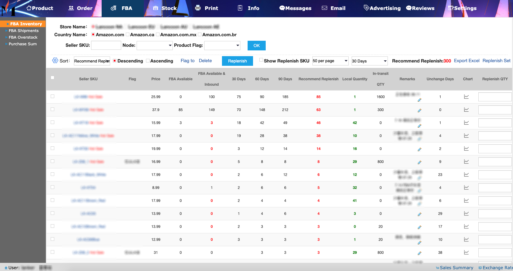 You can view the current inventory of FBA in each marketplace, the number in transit, the recent sales for 30 days and 90 days, and the number of replenishment days can be set. The recommended replenishment quantity can be automatically calculated based on history sales. and the required replenishment quantity can be entered and then create shipments quickly, you can download FBA label for each box and you can upload box content info to Amazon.